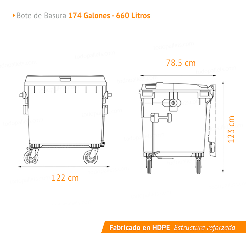 Es una opción confiable para entornos comerciales e industriales que necesitan una solución eficiente, duradera y sostenible para la recolección de basura. La capacidad de 660 litros asegura que pueda manejar los residuos de manera eficiente en espacios donde el flujo de personas y desechos es constante y elevado.