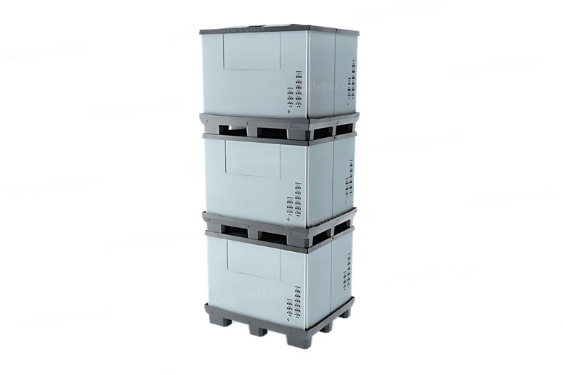 Contenedor plegable de 3 piezas (pallet, paredes y tapa), ideal para transporte de carga a granel. Fabricado por inyección, es resistente y fácil de manipular. Reduce su volumen hasta en un 80 %, optimizando el transporte de retorno y disminuyendo emisiones de CO₂. Su diseño permite un colapsado rápido en una sola unidad compacta.