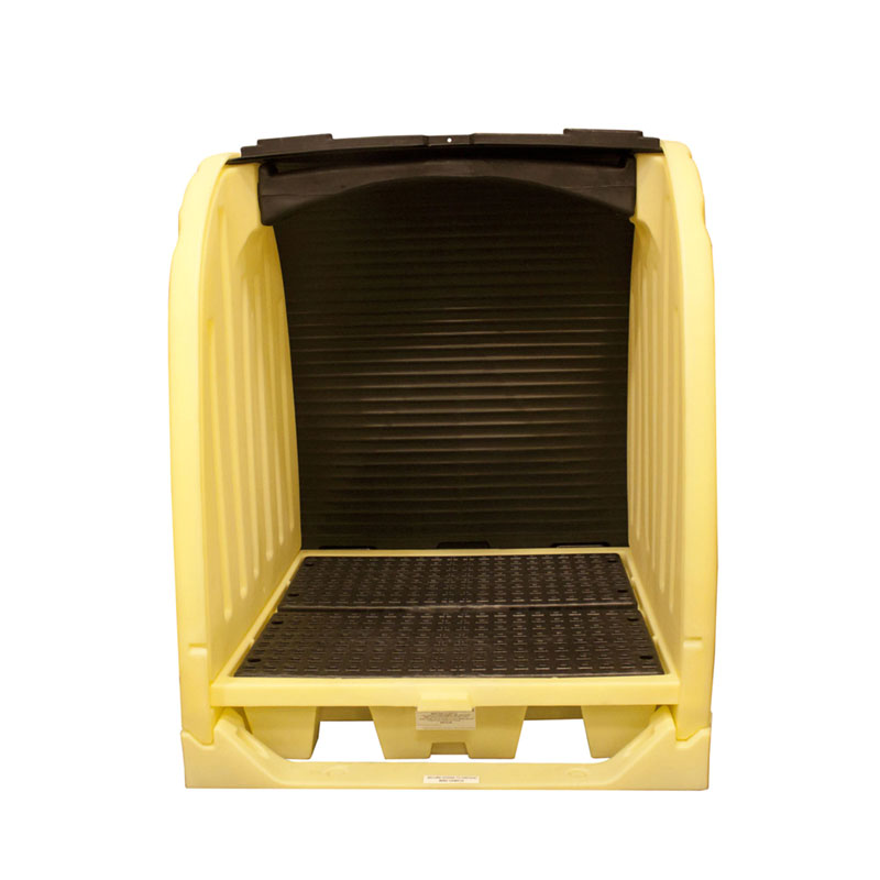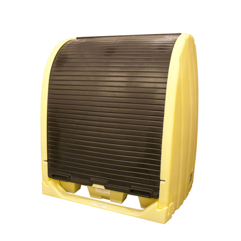 Gabinete de Seguridad para 4 Tambos Industriales resistente a químicos altamente corrosivos y a condiciones ambientales. Aprobado por Normas: EPA 40 CFR 264.175, SPCC, NPDES y UFC. Rejillas Removibles HDPE para su fácil limpieza, puertas corredizas con cerrojo de seguridad, entrada para montacargas.