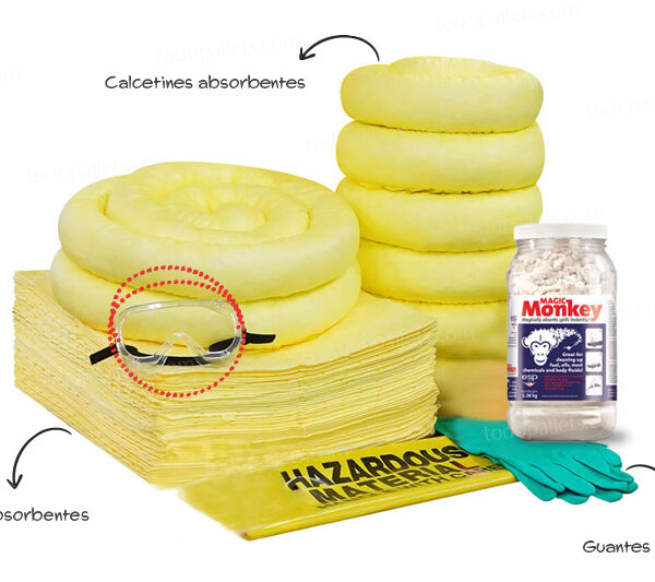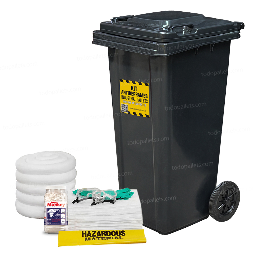 Equipado con todos los materiales necesarios, el kit garantiza una respuesta rápida y eficiente, cumpliendo con las normativas vigentes y manteniendo su lugar de trabajo seguro y limpio.