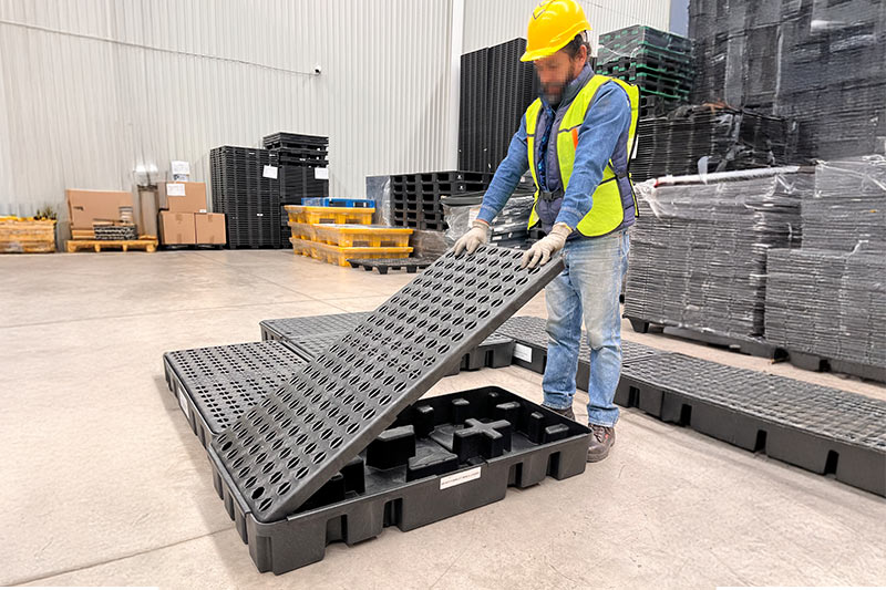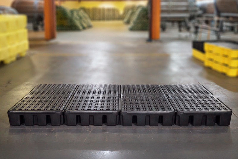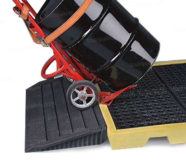 Plataforma Antiderrames para 2 Tambos Industriales resistente a hidrocarburos, aceites y a la corrosión. Fabricada con Polietileno de alta calidad. Aprobada por Normas EPA, SPCC y NPDES. Incluye rejilla removible HDPE para facilitar la limpieza y acceso al interior de la plataforma. Tiene entrada para montacargas y diseño ergonómico. Accesorio complementario Rampa PolyRamp Chica