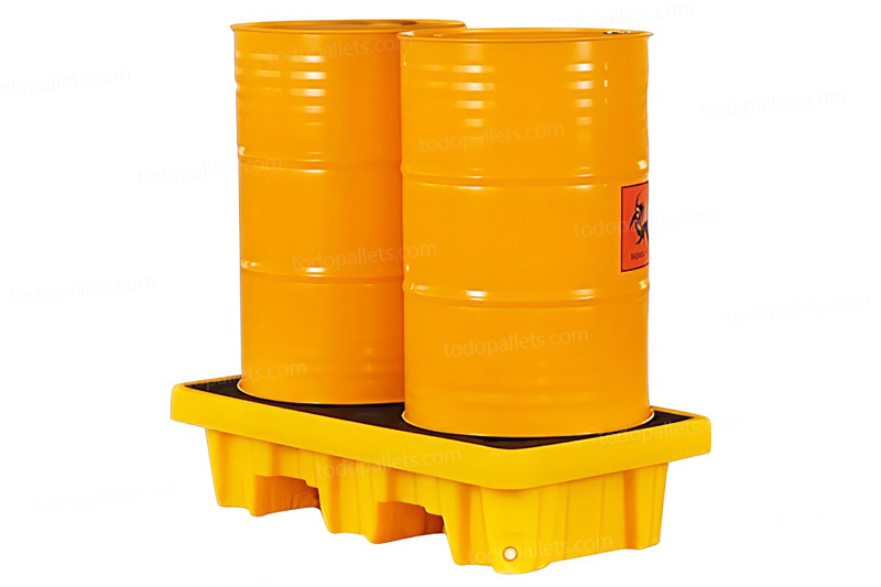 Tarima de plástico antiderrames para 2 Tambos Industriales, resistente a químicos altamente corrosivos o peligrosos. Fabricada con PE (Polietileno) 100% Virgen de Alta Densidad (HDPE). Aprobada por Normas: EPA 40 CFR 264.175, SPCC, UFC y NPDES. Reduce costos y optimiza el espacio de almacenamiento gracias a su diseño anidable. Cumple y excede la norma, cuenta con capacidad de derrame de hasta 250 litros.